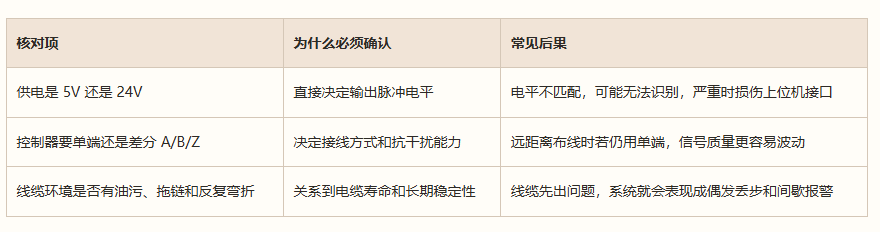 这一点必须单独拎出来讲。资料里已经写得很明确:读数头输出脉冲信号电平严格跟随供电电压。供电 24V,单端输出就是 24V;供电 5V,差分输出就是 5V。很多现场故障不是传感器不准,而是接口根本没匹配。