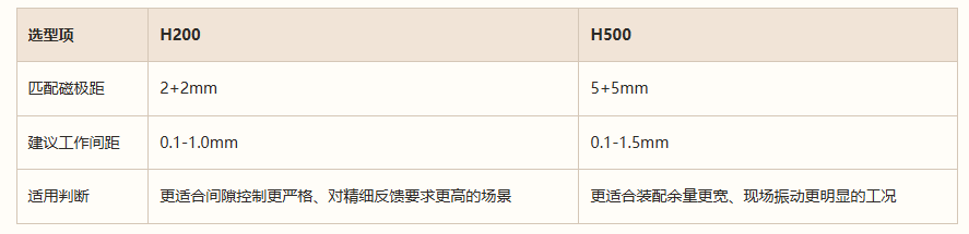 资料里给出的间隙条件已经很清楚。H200 的工作面距磁条高度要控制在 0.1-1.0mm,H500 则是 0.1-1.5mm。这不是“建议值”,而是系统稳定运行的基本前提。很多现场调试时信号忽高忽低,最后查下来,不是芯片问题,也不是软件问题,而是安装支架跳动或基准面不平。