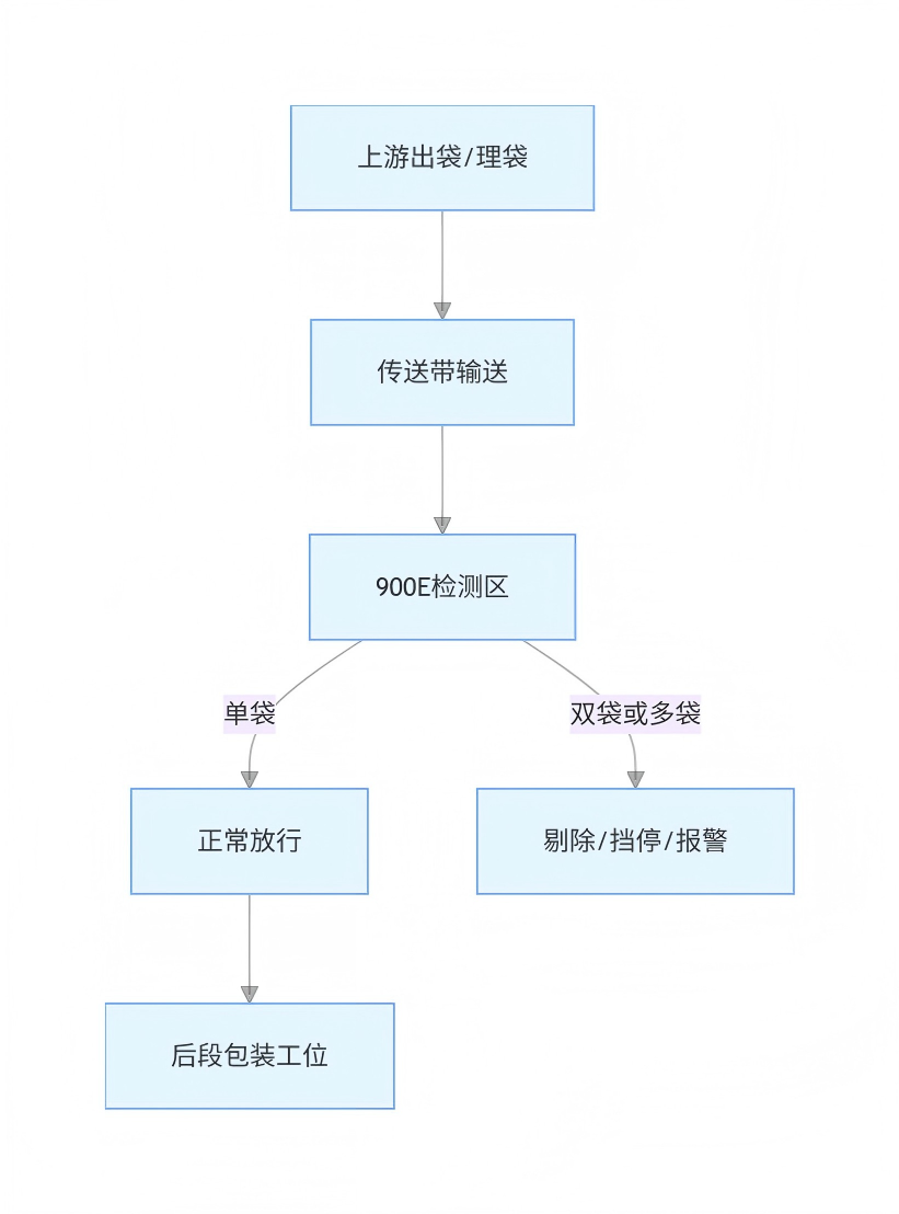 含铝箔层包装袋在输送段出现双袋、叠袋、两个一起过去,真正要解决的不是“看见袋子经过”,而是尽早判断当前经过的是单袋还是多袋叠放。处理顺序应当是:先确认袋型内部是否有连续铝箔层,再把检测点前移到姿态更稳定的输送段,用真实袋样建立单袋和叠袋阈值,最后再联动剔除或报警。这样比单纯靠人工盯检或只补一个光电,更容易形成稳定闭环。