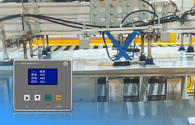 在机器人末端执行器(吸盘架)上,集成安装阿童木双张检测器8000S的传感器探头。当机器人完成取料,探头对当前吸取的板料进行瞬时检测。